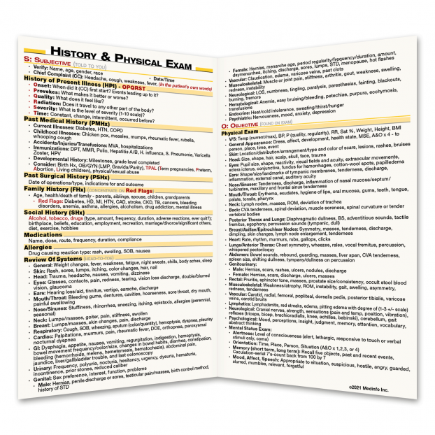 Write the perfect H&P with this pocket card that includes all the basic lab values used every day by healthcare students and professionals. Inside this folding card you’ll have a full History and Physical Exam template with descriptors and helpful suggestions to review with your patients. This easy to read and super helpful layout will keep you organized and ready to perform at your peak. On the outside, you’ll find all the basic labs and skeleton diagrams for BMP, LFTs, CBC, ABGs with guidelines for classifying patients’ acid base disorders.