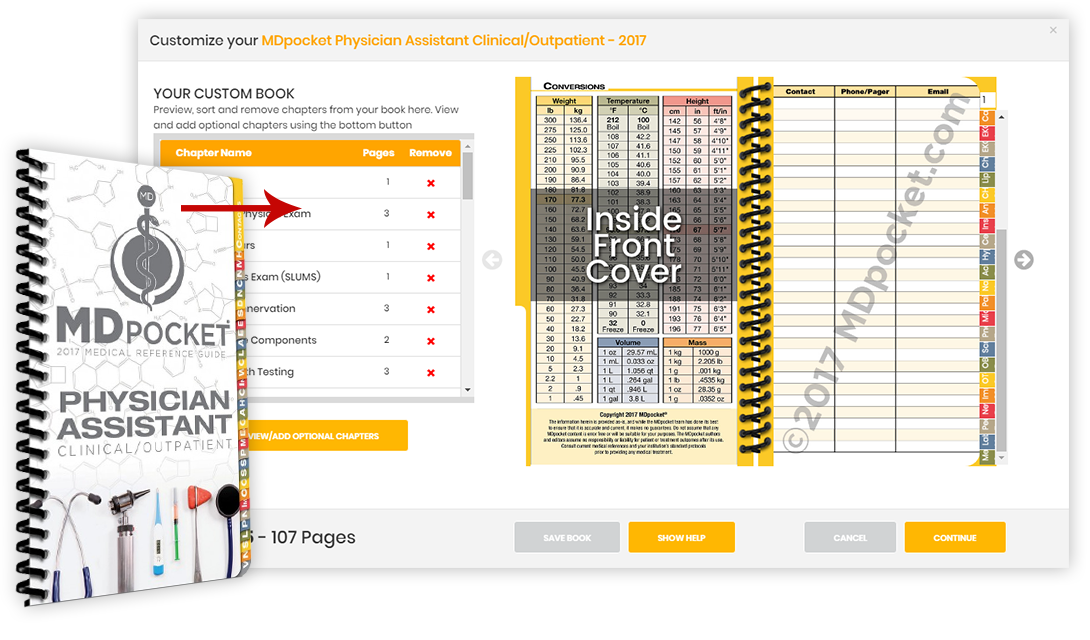 The Clinical/Outpatient Physician Assistant guide from MDpocket contains detailed pocket medical information for PAs working in clinics or outpatient settings. This compact pocket-size reference has information on writing and performing Physical Exams, assessing cardiac murmurs, cranial and peripheral nerves, strength testing, dermatome areas, EKG and CXR interpretation, stress testing, evaluating acute coronary syndromes, hypertension treatment, statin therapy, diabetes management and much more. This pocket reference provides over 100 pages of vital day-to-day medical treatments, management and workup specifically for a Physician Assistant or Physician Assistant Students.